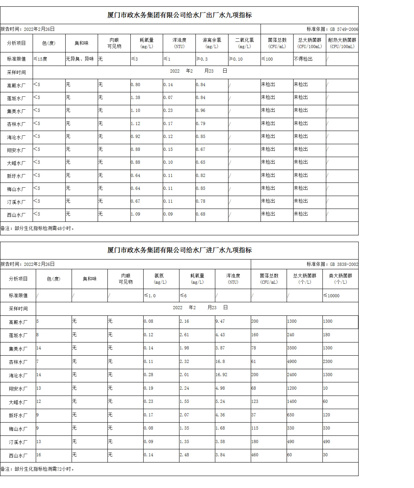 2022年2月23日厦门市政水务集团给水水厂水质信息公布