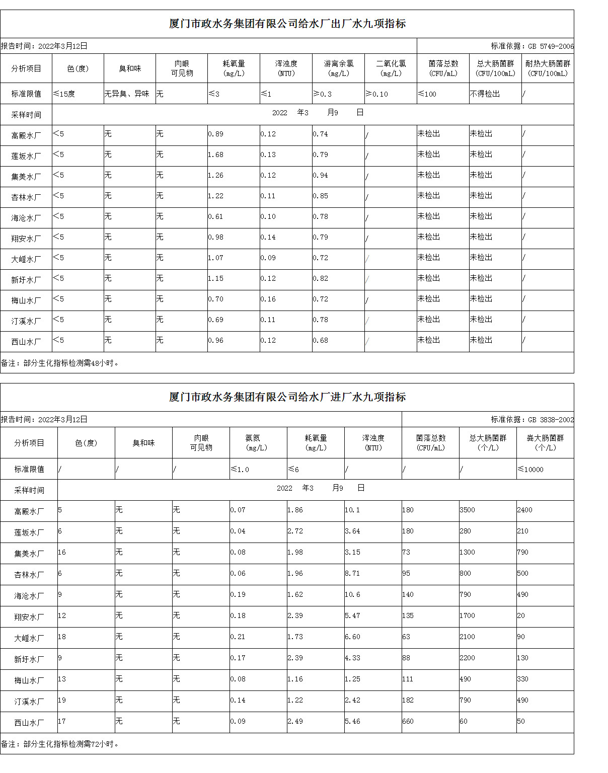 2022年3月9日厦门市政水务集团给水水厂水质信息公布