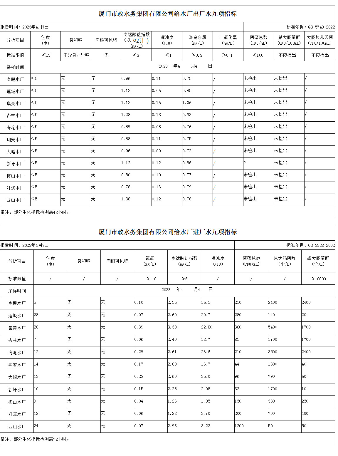 2023年04月4日厦门市政水务集团给水水厂水质信息公布