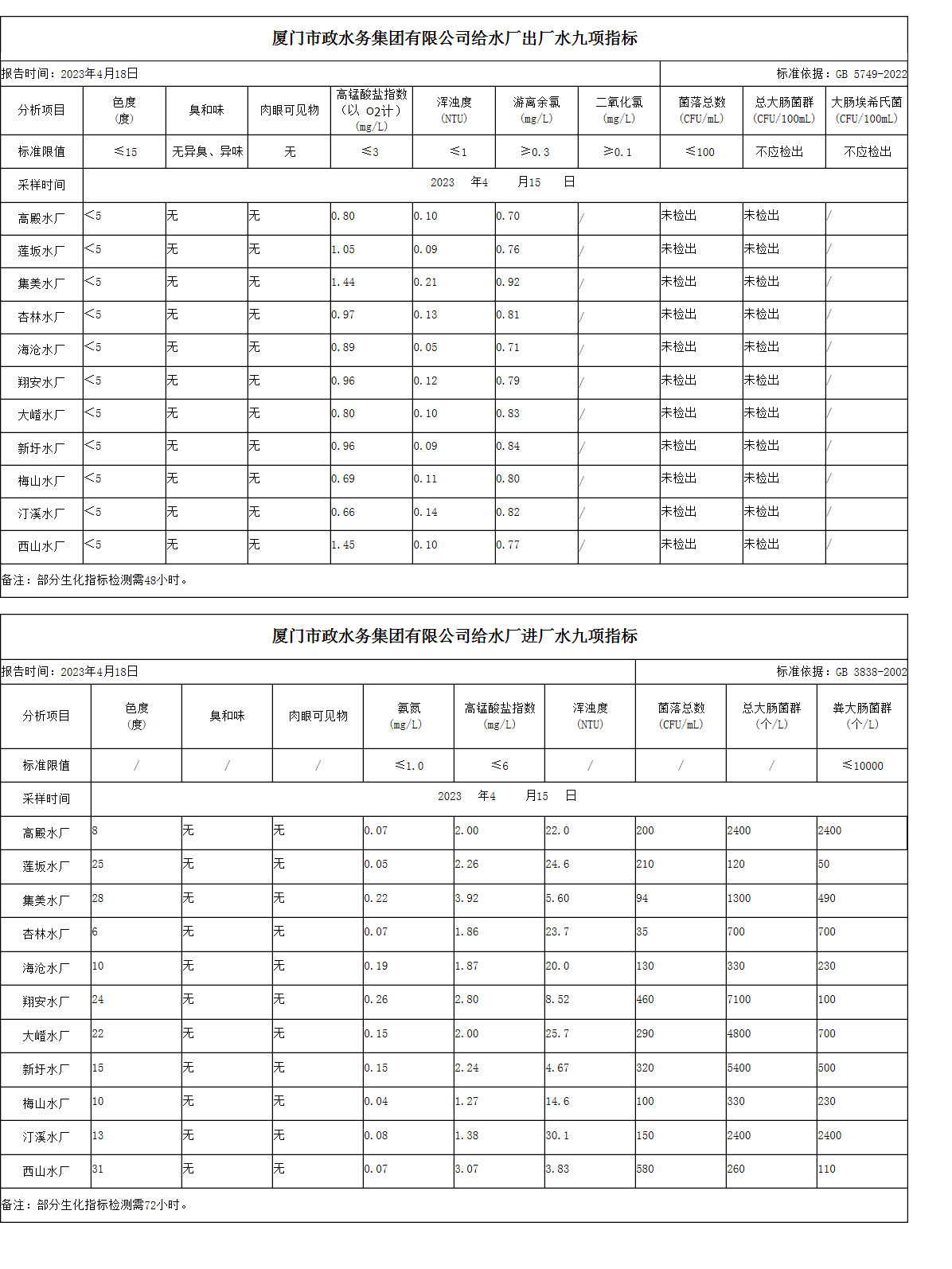 2023年4月15日厦门市政水务集团给水水厂水质信息公布