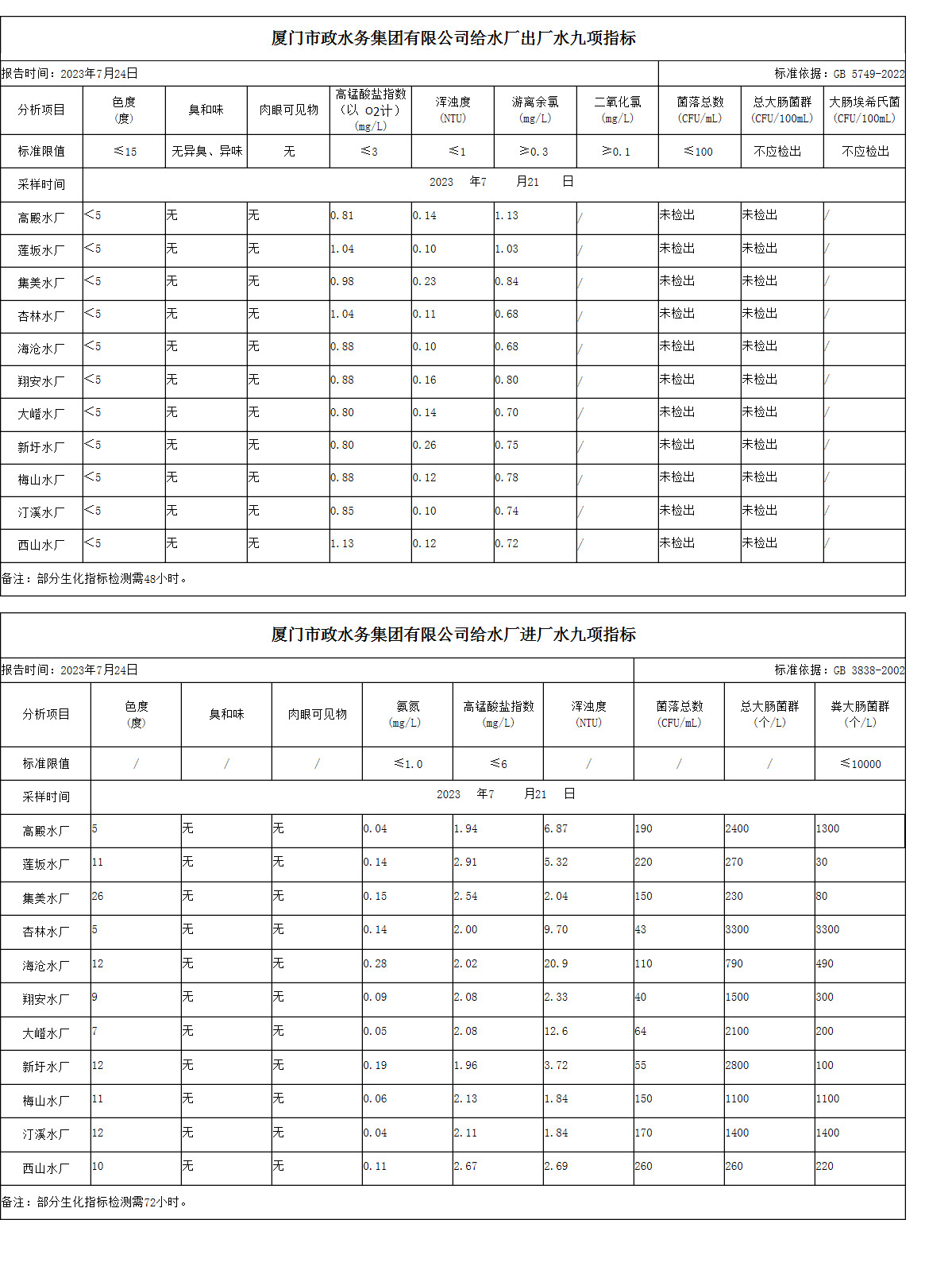 2023年7月21日厦门市政水务集团给水水厂水质信息公布