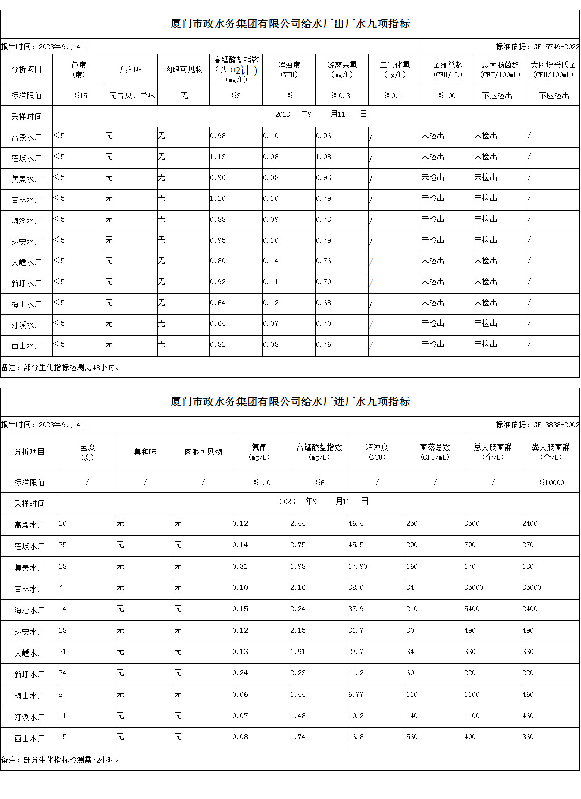 2023年9月11日厦门市政水务集团给水水厂水质信息公布