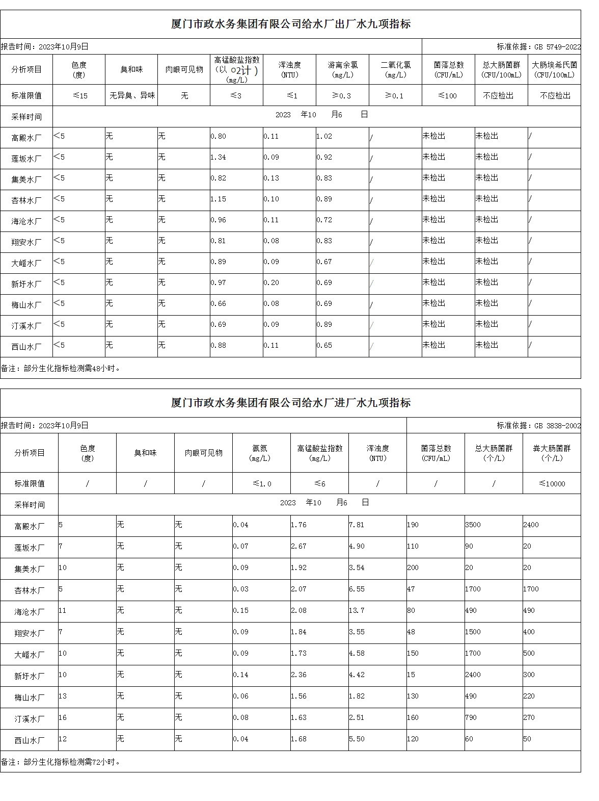 2023年10月6日厦门市政水务集团给水水厂水质信息公布