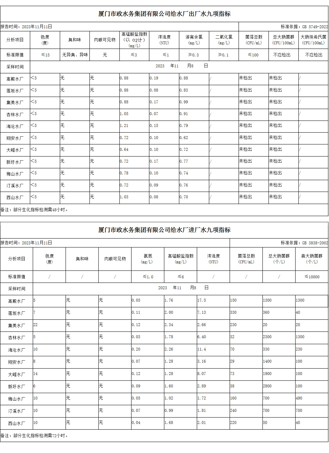 2023年11月8日厦门市政水务集团给水水厂水质信息公布