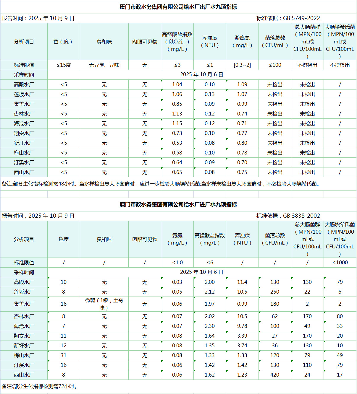 2025年10月6日厦门市政水务集团给水水厂水质信息公布