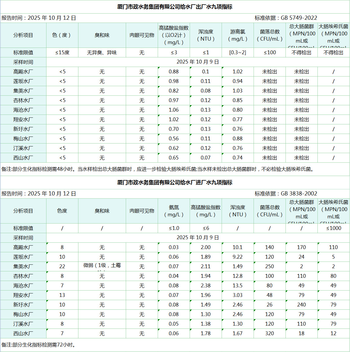 2025年10月9日厦门市政水务集团给水水厂水质信息公布