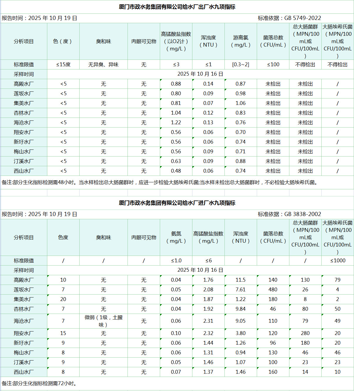 2025年10月16日厦门市政水务集团给水水厂水质信息公布