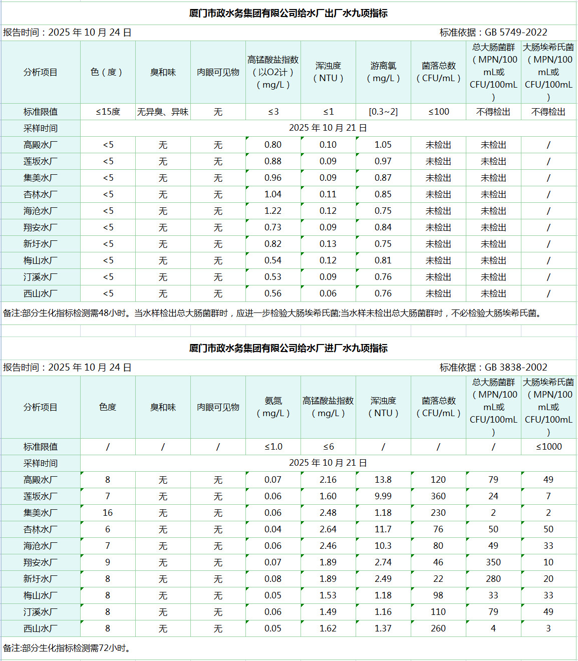 2025年10月21日厦门市政水务集团给水水厂水质信息公布