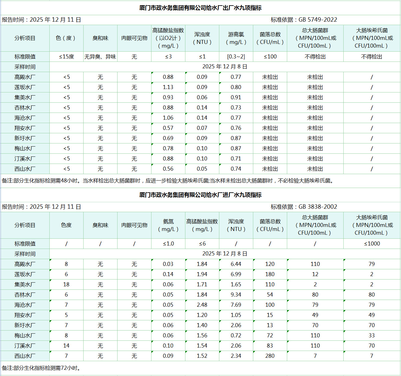 2025年12月8日厦门市政水务集团给水水厂水质信息公布