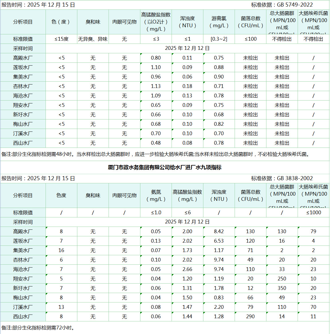 2025年12月12日厦门市政水务集团给水水厂水质信息公布