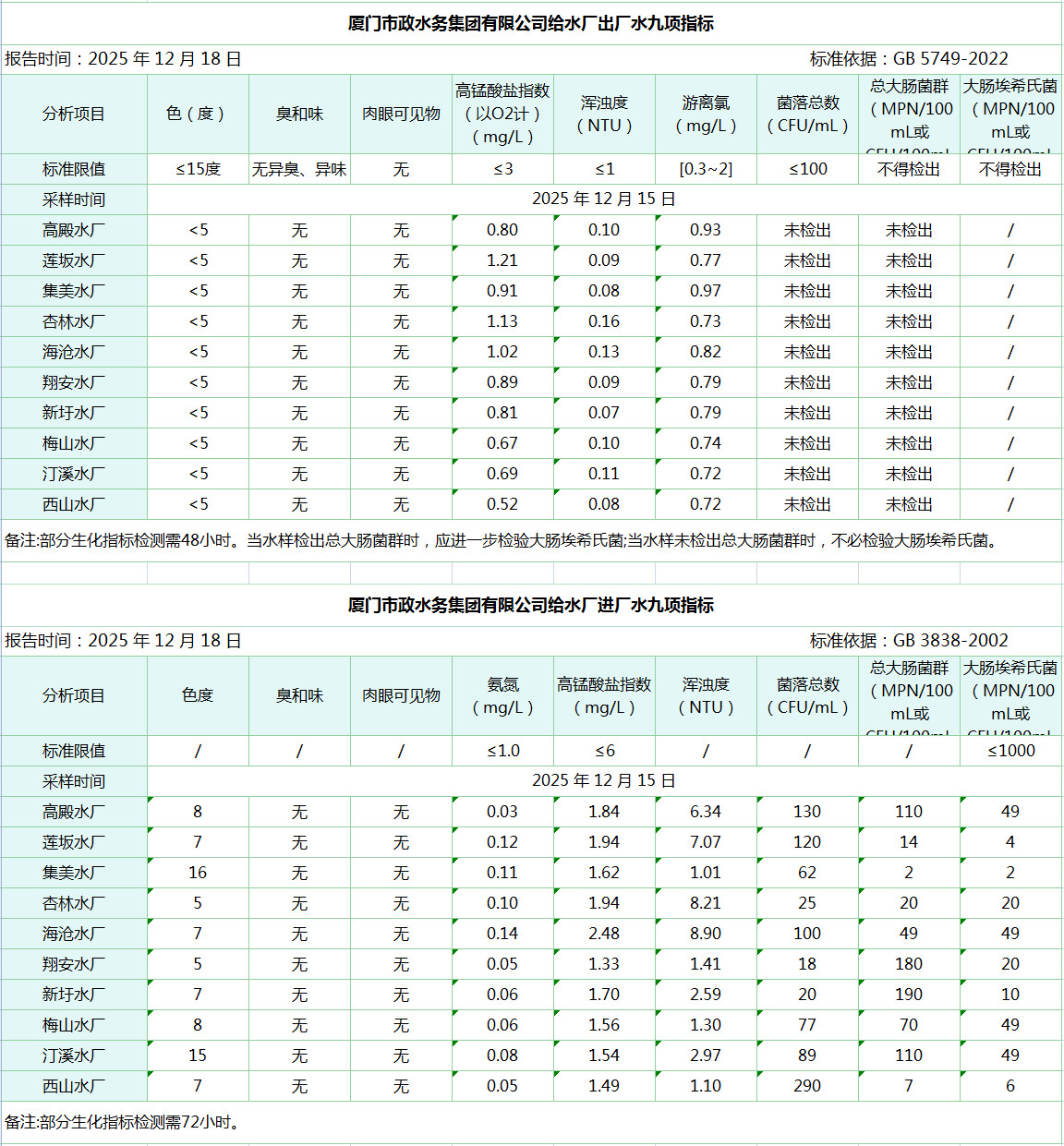2025年12月15日厦门市政水务集团给水水厂水质信息公布