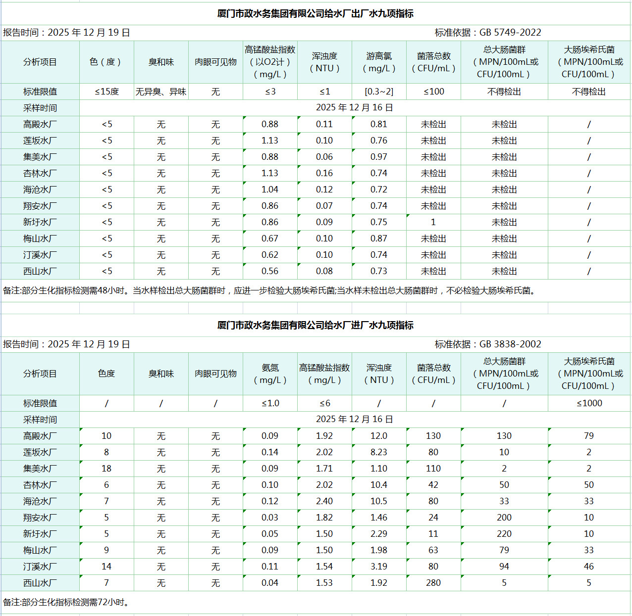 2025年12月16日厦门市政水务集团给水水厂水质信息公布