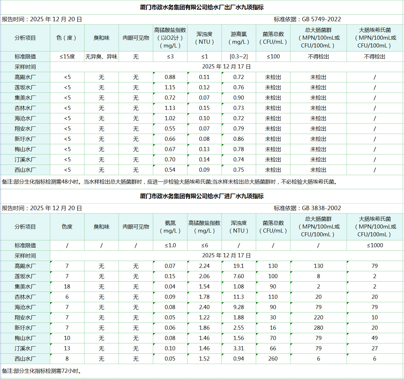2025年12月17日厦门市政水务集团给水水厂水质信息公布