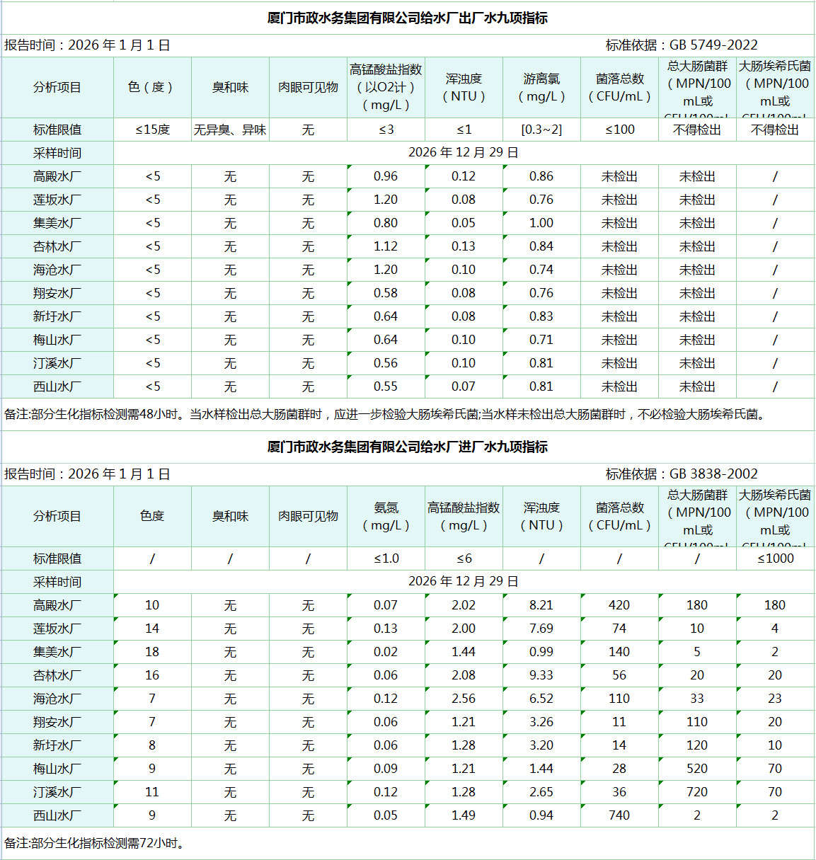 2025年12月29日厦门市政水务集团给水水厂水质信息公布