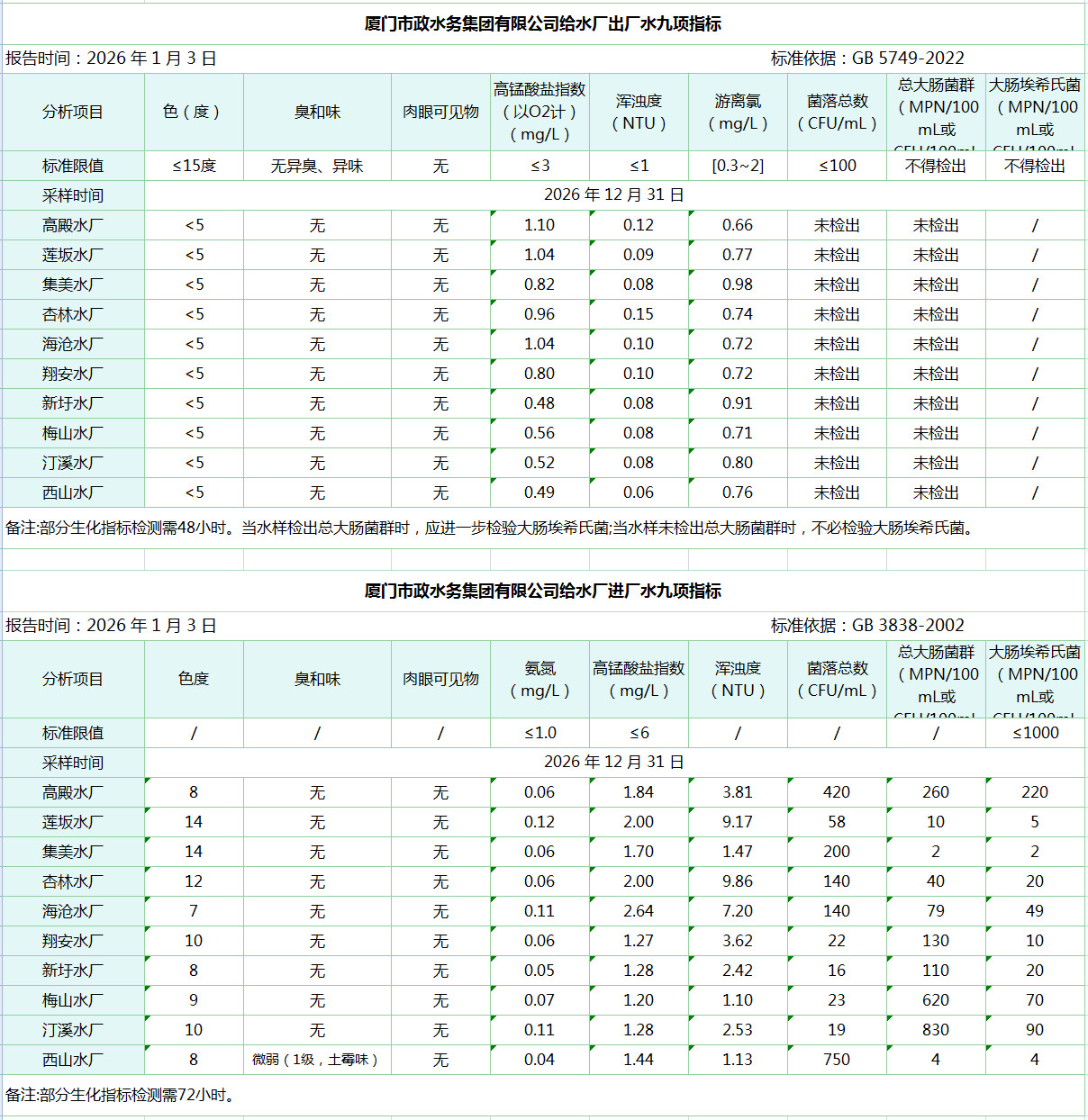 2025年12月31日厦门市政水务集团给水水厂水质信息公布