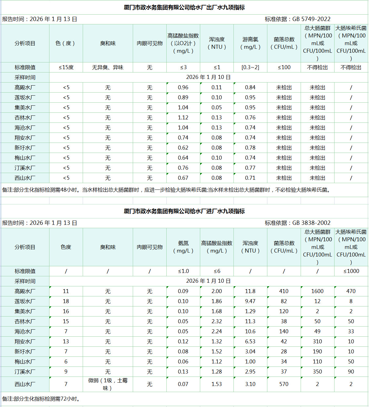 2026年1月10日厦门市政水务集团给水水厂水质信息公布