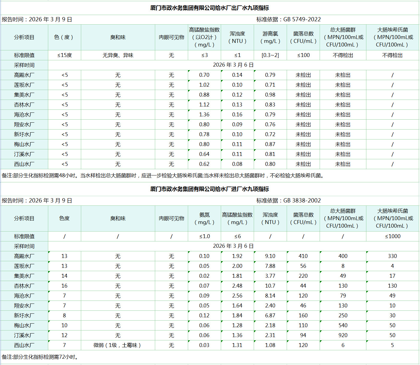 2026年3月6日厦门市政水务集团给水水厂水质信息公布