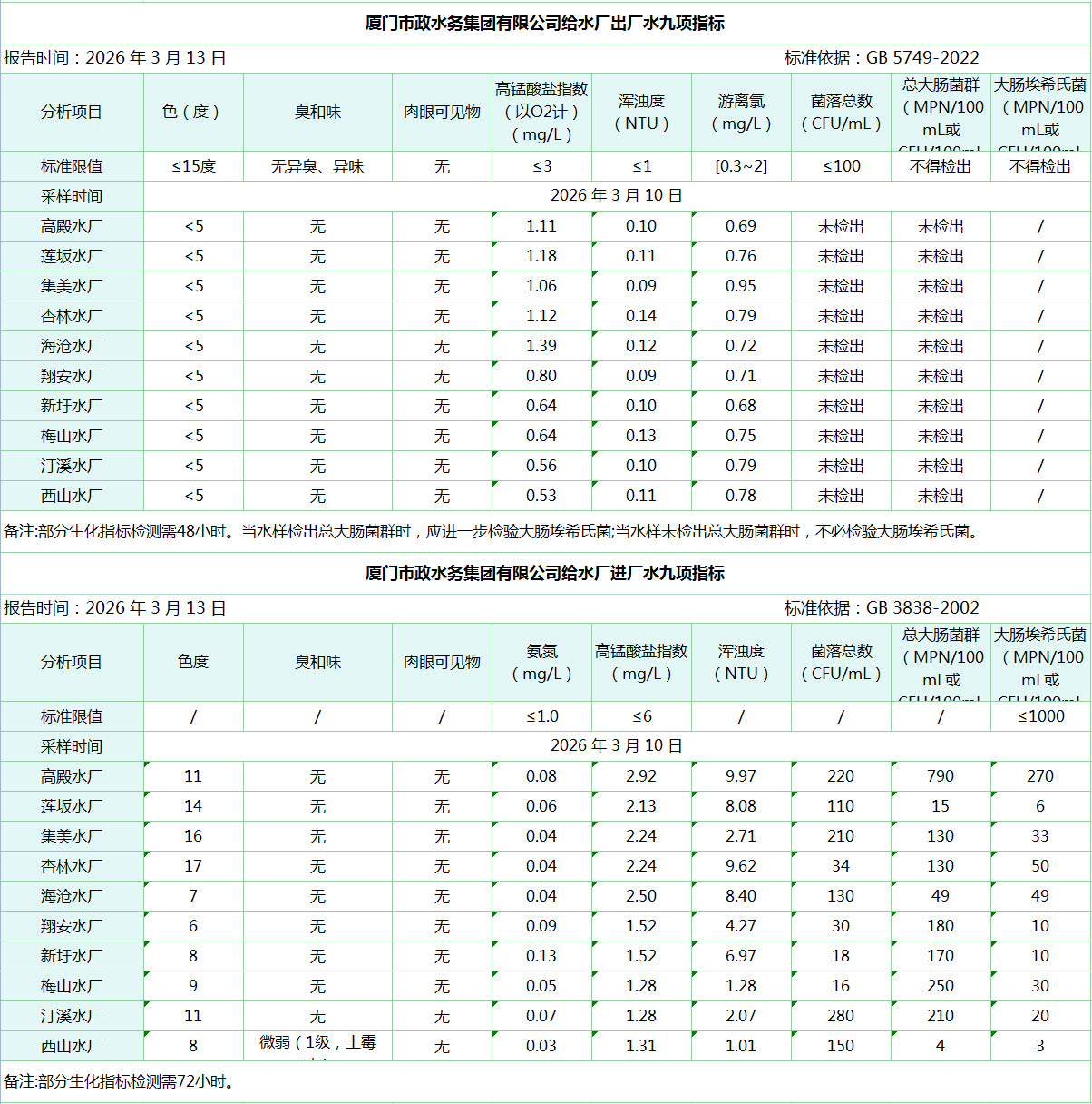 2026年3月10日厦门市政水务集团给水水厂水质信息公布