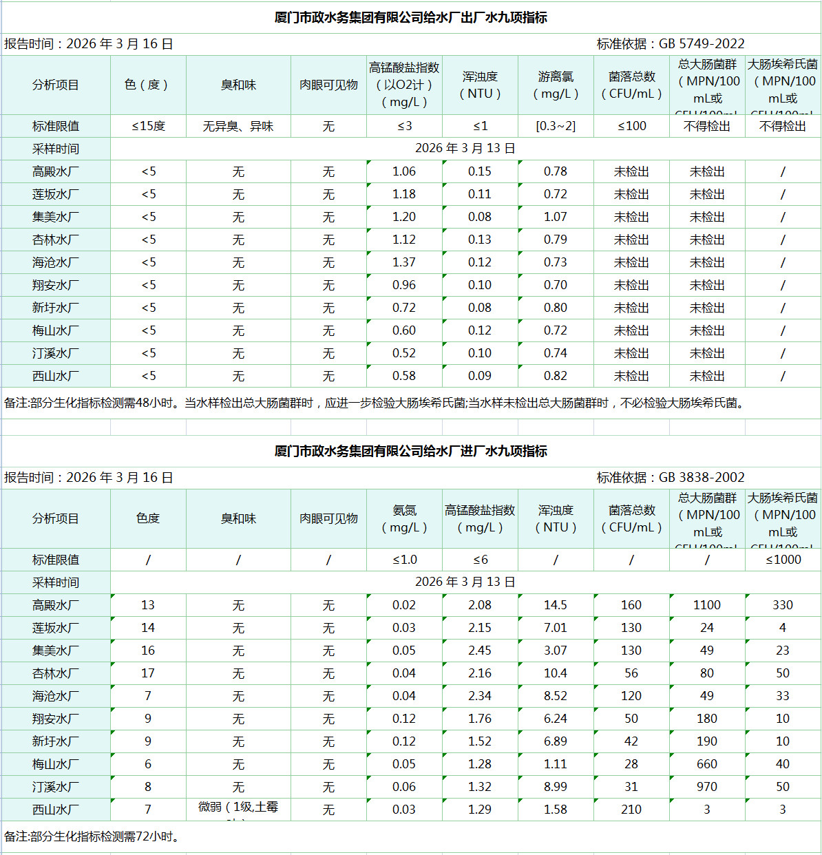 2026年3月13日厦门市政水务集团给水水厂水质信息公布