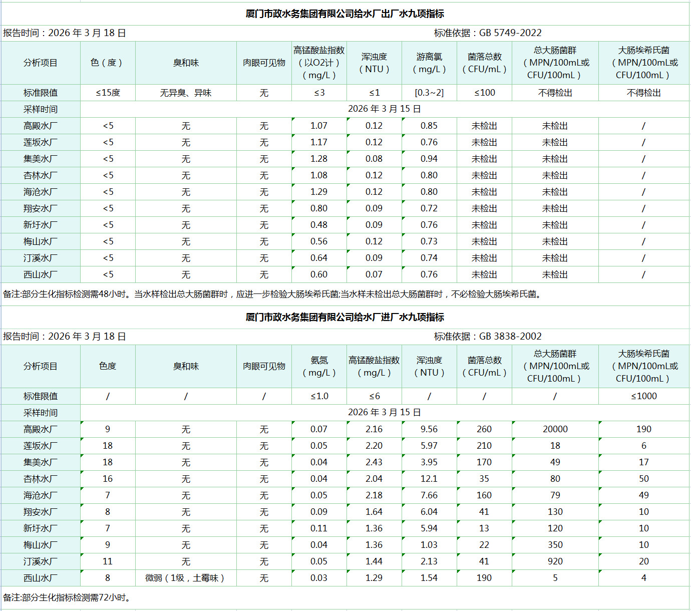 2026年3月15日厦门市政水务集团给水水厂水质信息公布