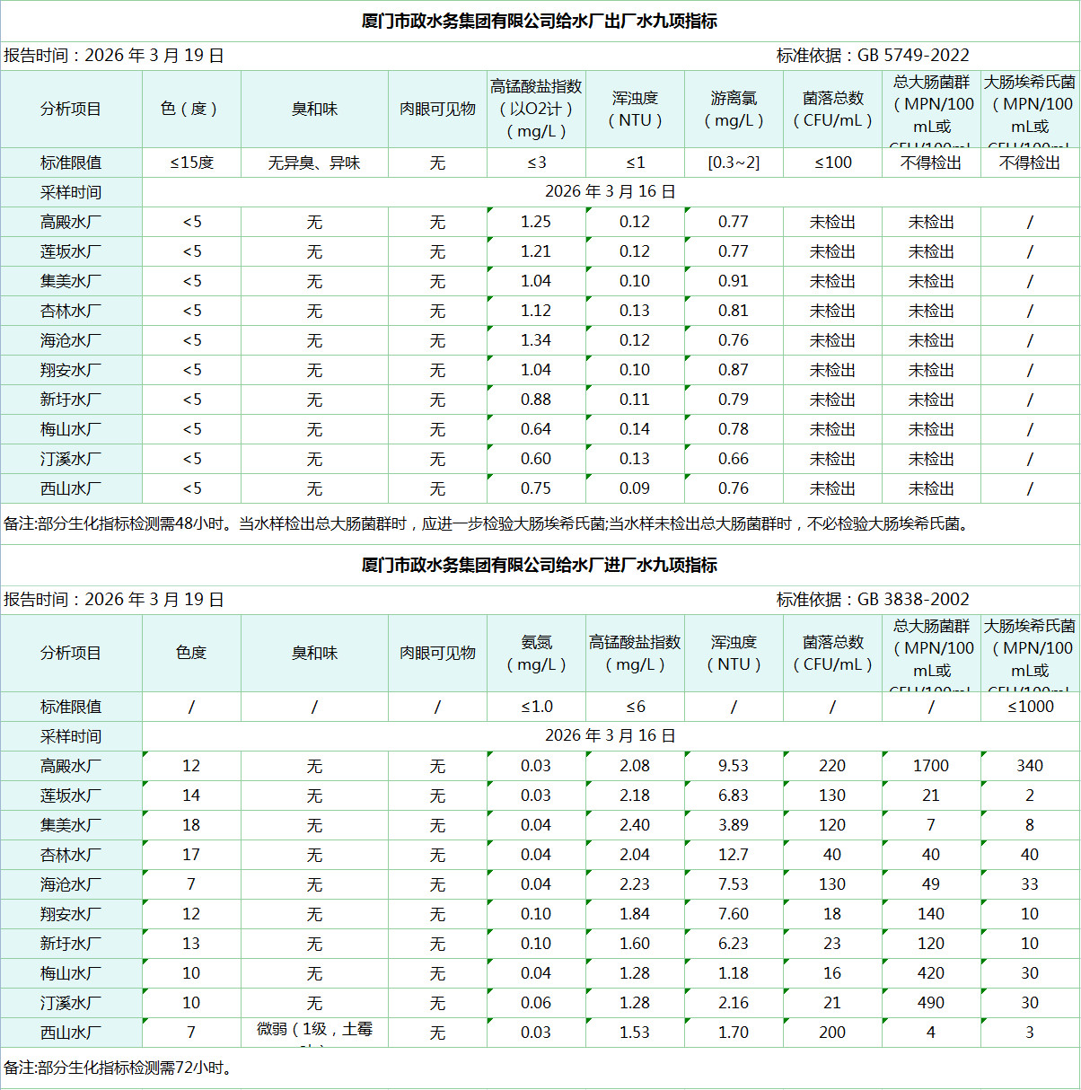 2026年3月16日厦门市政水务集团给水水厂水质信息公布