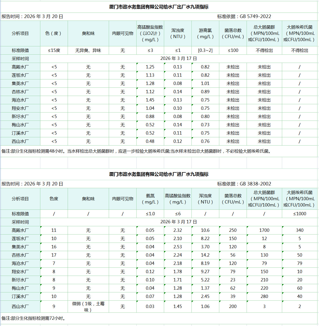 2026年3月17日厦门市政水务集团给水水厂水质信息公布