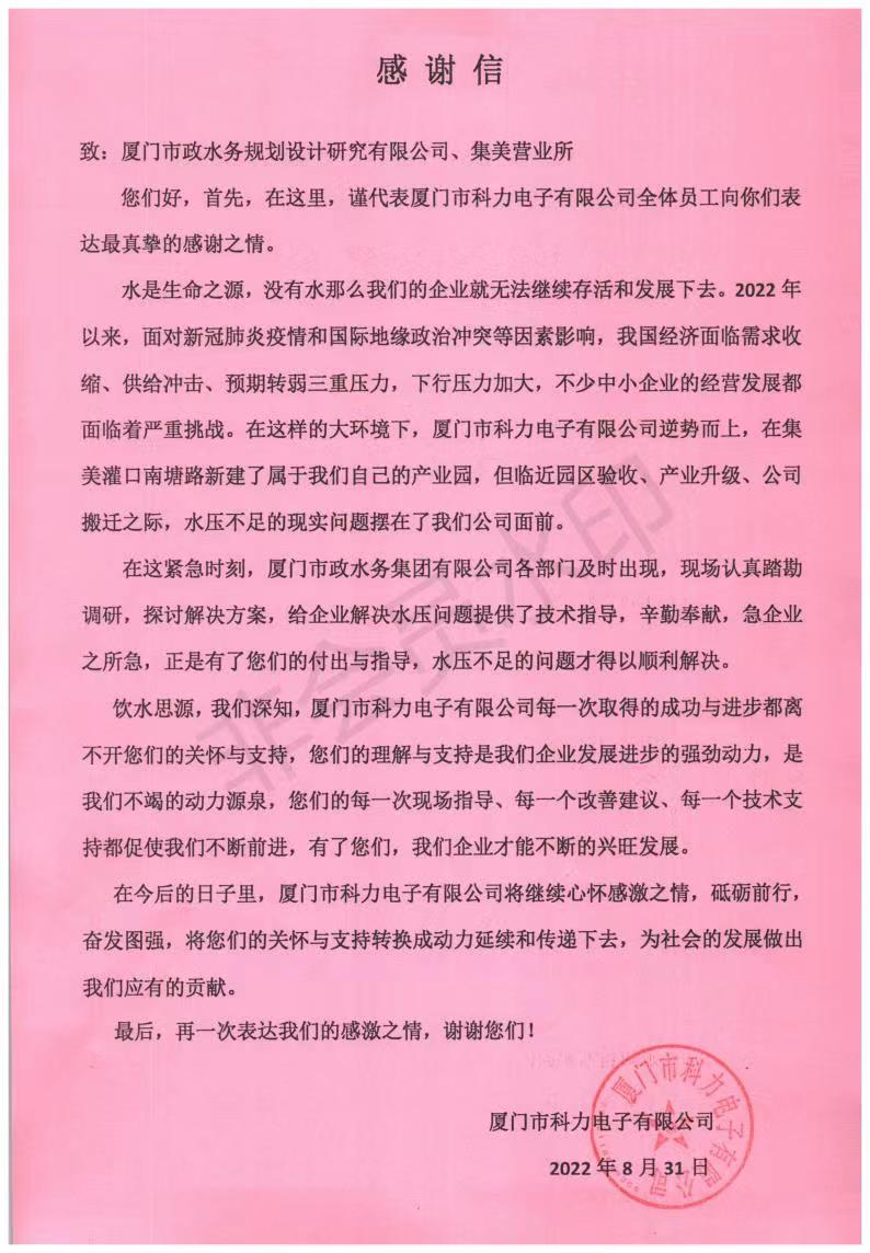 2022年9月,厦门市科力电子有限公司给厦门市政水务集团集美营业所送来一份感谢信,对集美营业所“优化营业环境,提升服务质量”的付出表示感谢。